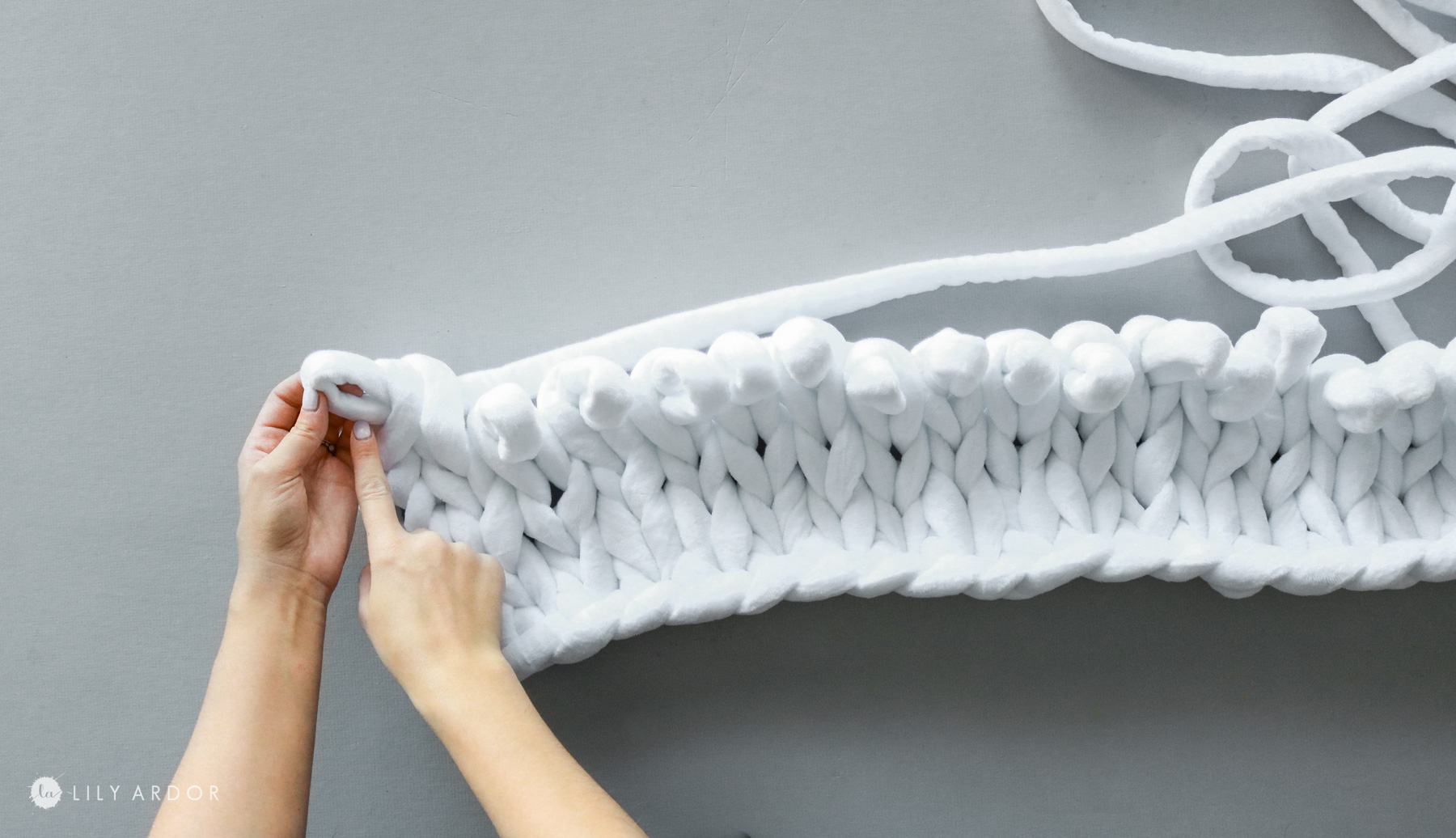 The simple concept behind this technique is all about pulling out loops. I broke it up into 3 easy steps. You’ll first need to make a braid. Than build up the knit on that braid and to finish I double looped. That’s it!
