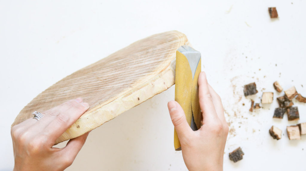 This is pretty easy to do. I tried a few different ways and this by far was the quickest and easiest. Simply use a flat head screw driver and a hammer to chip away all the rough edges. You can leave some bark visible or remove it all completely. Both look gorgeous 😊 ! Than lightly sand the edges and the top.