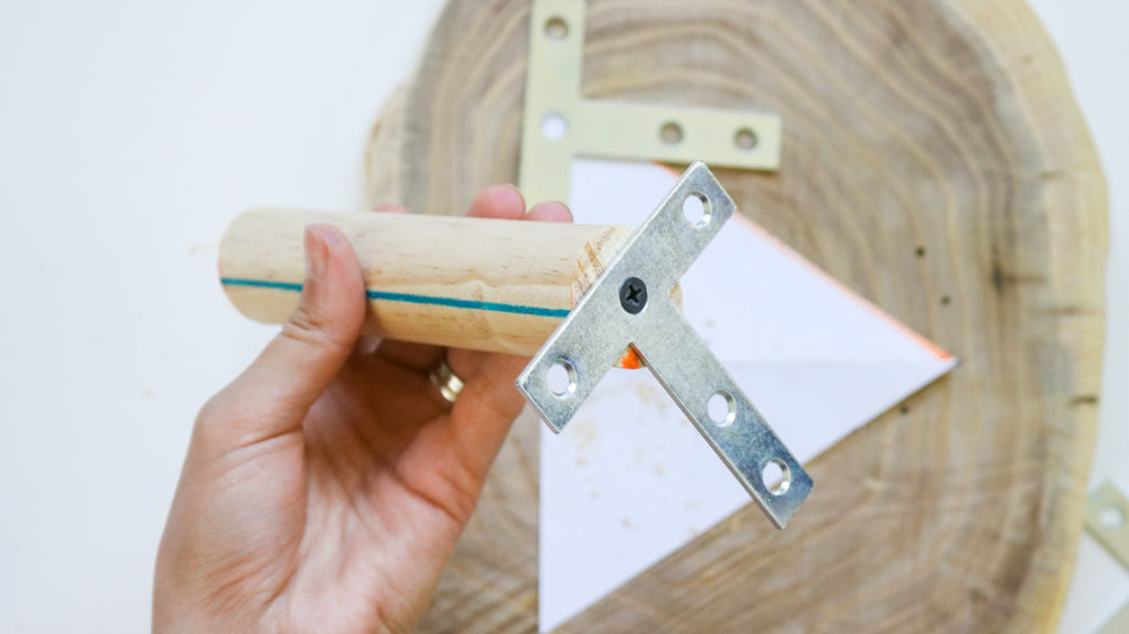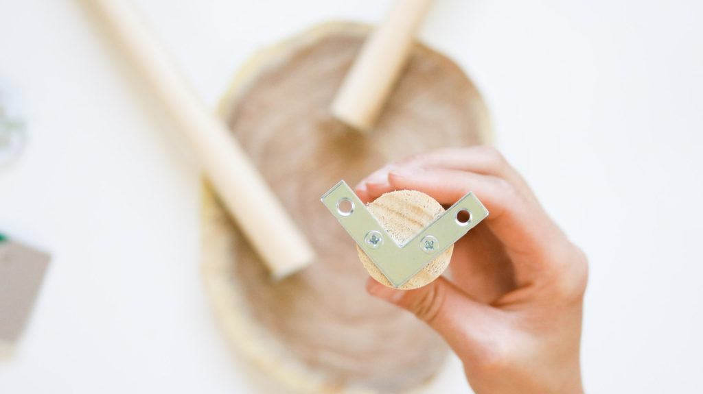If you’re thinking of trying an L plate like shown in the photo below than I’m here to tell you it’s not going to work. I tried this and sadly the legs were so wobbly they couldn’t hold a plant. Save yourself the trouble and go for a heavy duty T plate. You can also drill right through the wood slice into your wooden legs however I avoided this since I didn’t want to ruin the pretty wood grain look on the wood slice.