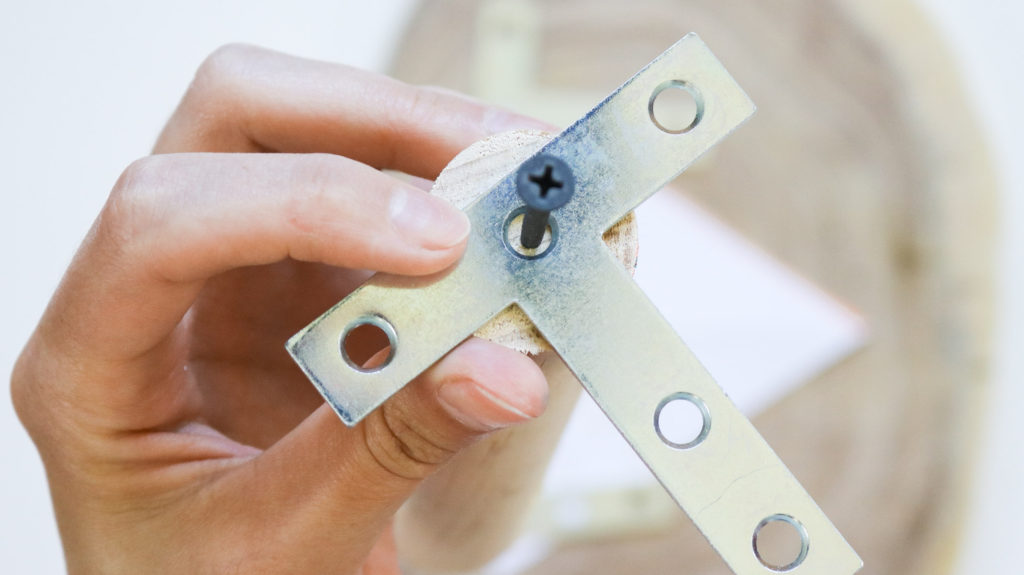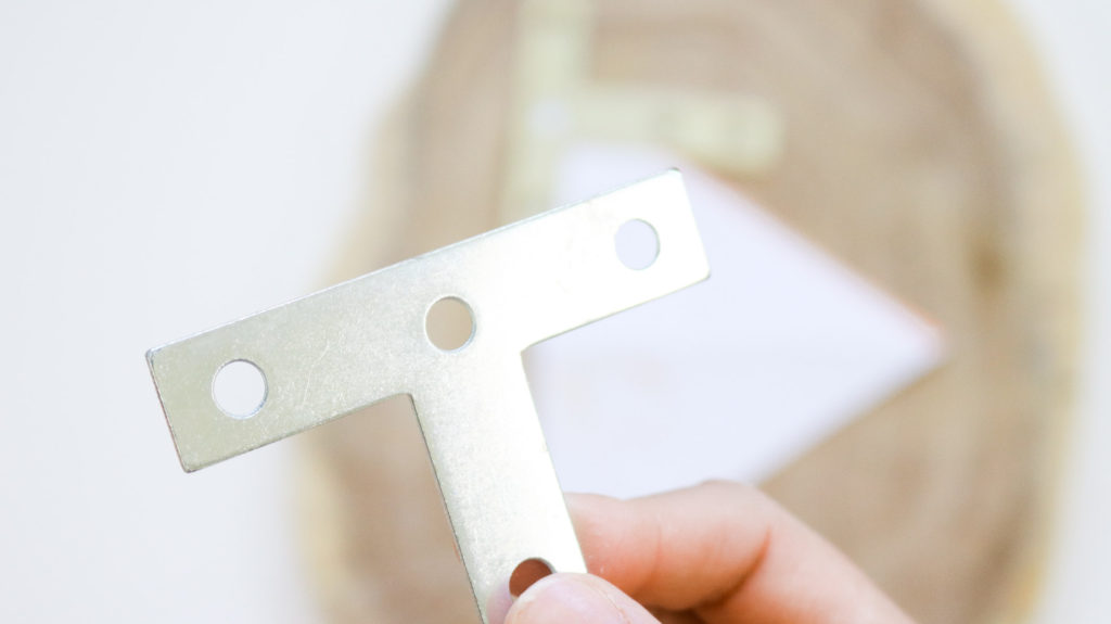 If you’re thinking of trying an L plate like shown in the photo below than I’m here to tell you it’s not going to work. I tried this and sadly the legs were so wobbly they couldn’t hold a plant. Save yourself the trouble and go for a heavy duty T plate. You can also drill right through the wood slice into your wooden legs however I avoided this since I didn’t want to ruin the pretty wood grain look on the wood slice.