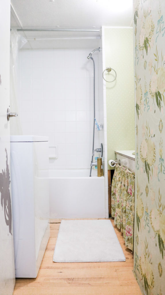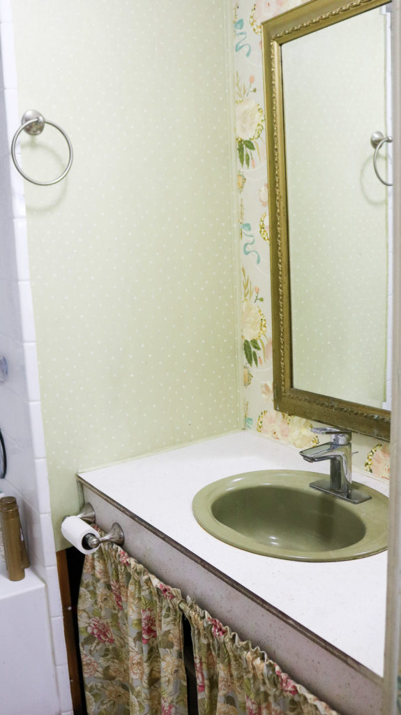 Just a fair warning! It’s not a pretty sight. There’s a green sink and green walls to match it 😂! I have big plans for this bathroom and can’t wait to start. The wallpaper walls you see were flowers I hand painted while I was into shabby chic decor. I’m so over the green. Honestly, I look back at it and wonder what was I thinking when I painted it 🙈! OH😑 and no under the sink cabinet. I use a small curtain to make it look somewhat decent. It’s just an empty space with a visible water heater inside 🙈 I can’t make a legit cabinet even if I wanted to. This whole house isn’t a legal structure. It’s half home half mobile home that someone pretty much slapped together. Like a DIY type house! LOL 😅 not a good DIY though! Whatever I have planned for this house will be temporary and probably not up to code😬. The floor is cracked and soaks up water.. 😏 which is something I’m trying to fix as well. I don’t want to remove the old floor because it’s too much work for something temporary and at the same time I don’t want it to look crappy. LOL😂! There’s also the mold to consider. Oh gosh. We’ll see. It is what it is and I’m happy to have a roof over our heads.