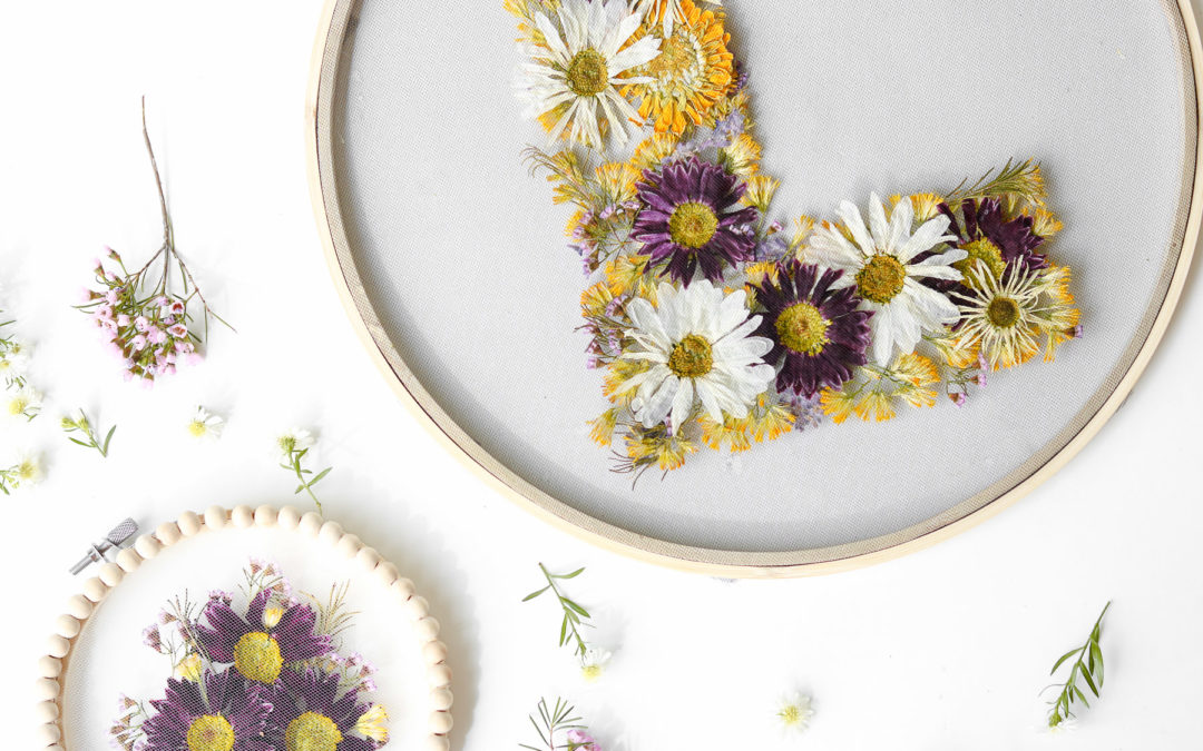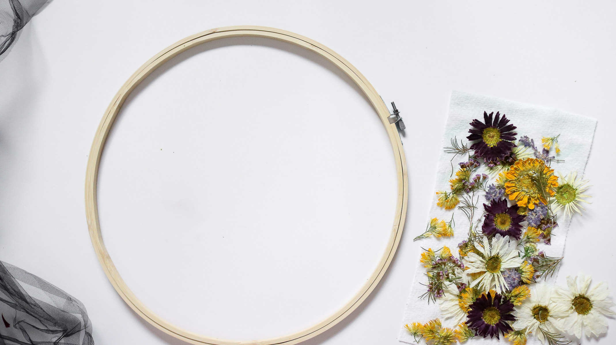 If you’re looking at persevering some flowers or making some floral wall art than your in the right place. Last time I did a similar project to this was for mother’s day and it’s still one of my favorite projects. I’ve been asked multiple times if my flowers faded and although some of the flowers show some fading the purple and yellow flowers show no difference at all. I’m was pretty happy with the results so I decided to give my first project a little twist. A few weeks ago I saw a floral hoop on craftgawker except they used mesh, not tulle and paper flowers instead of real ones. I immediately knew I wanted to make something similar just with real pressed flowers. That’s when I realized I follow this talented lady on instagram although I haven’t seen her in my feed for ages because of instagrams new algorithm, but she posts the most beautiful floral crafts. Her name is Olga Prinku and she is truly amazing. If you need some inspiration check her feed out. She even has a youtube video showing how she makes her flower hoops. Very intricate work. She literally weaves the stems into her mesh. After checking the web out a little I decided to try laying my pressed flowers between stretched tulle. It seemed like a good idea since it would be a lot quicker than weaving the flowers into fabric. I’ve never seen it done this way but, after a few attempts it actually worked! YAY! The most exciting part about this project is how quick you can press your flowers.. YEP!! I’ll be showing you how to press your flowers in under 3 minutes! No books needed… Okay than let’s make some floral hoops. Here’s a quick video version