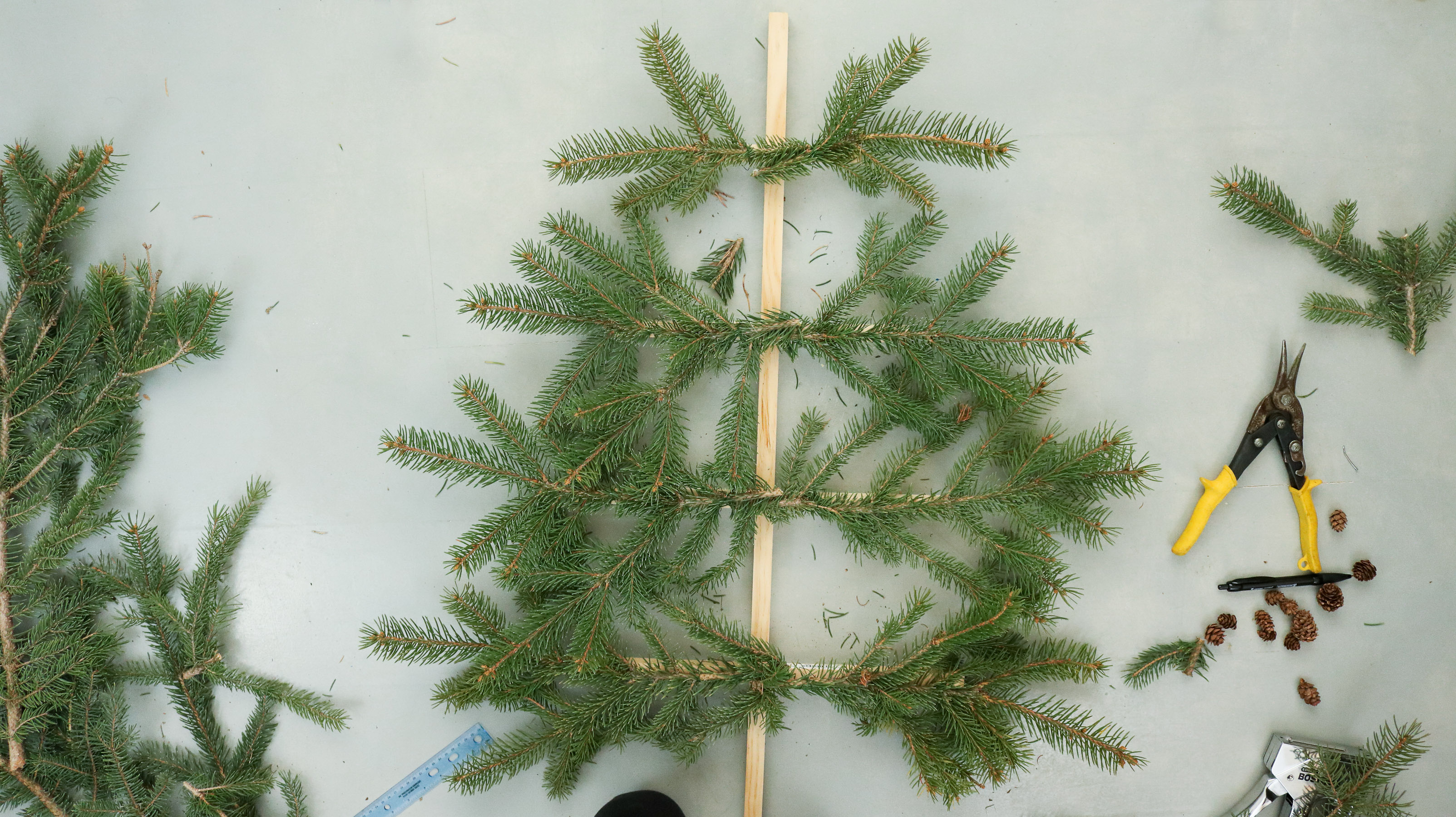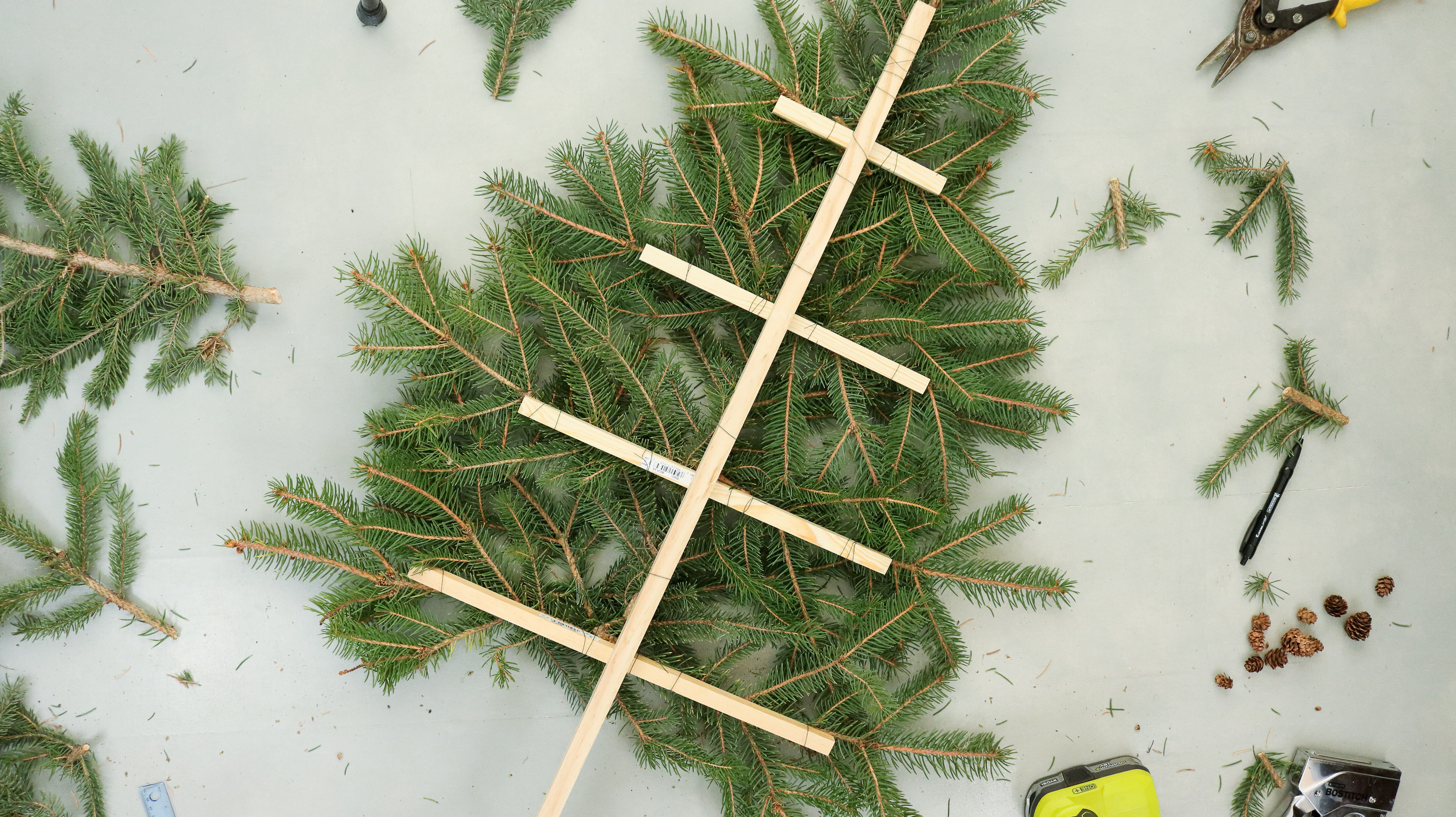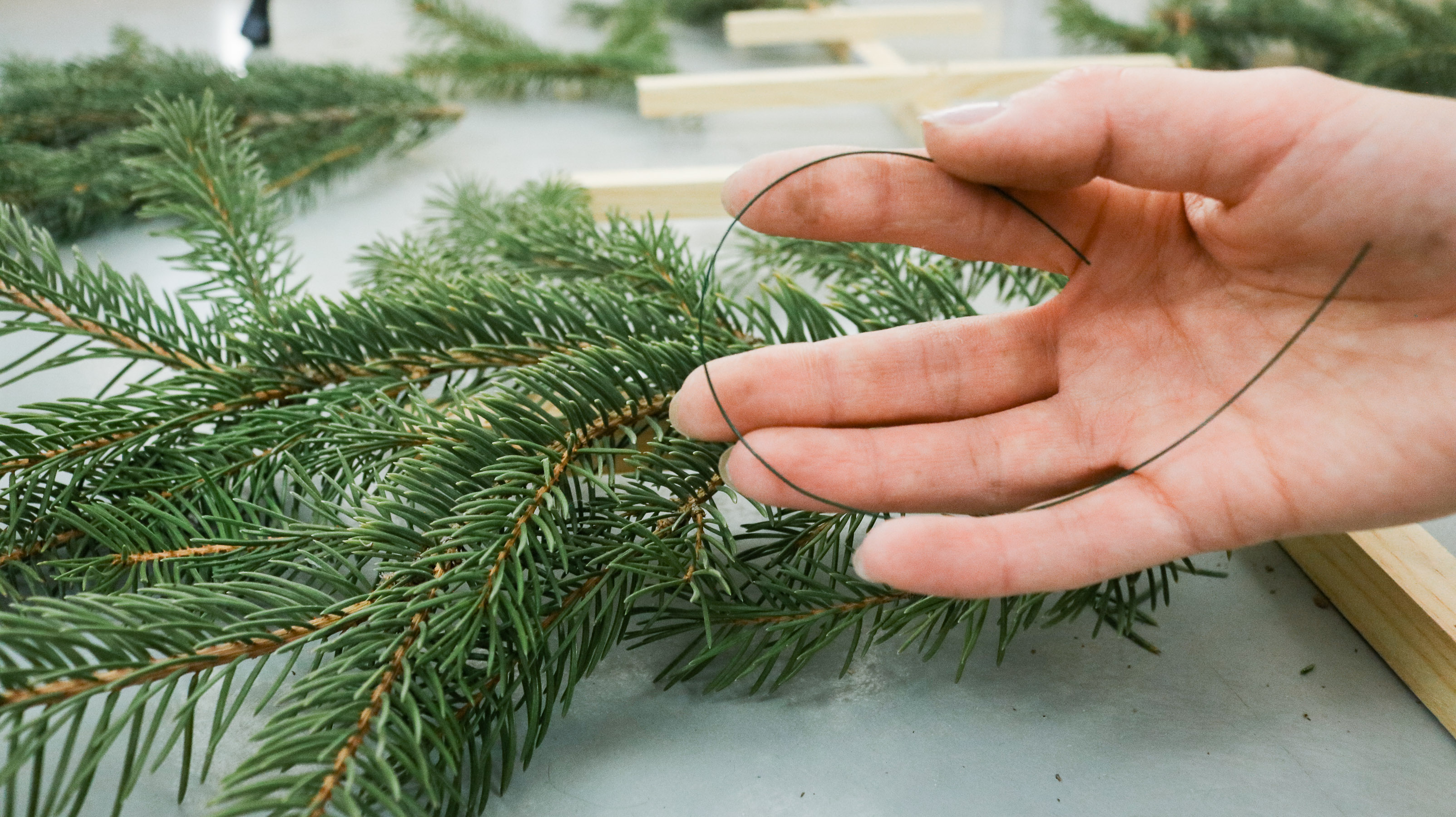 Than one by one start attaching them to your dowel with wire. Try and secure each branch in two separate spots. Closer to the center and on the edge.