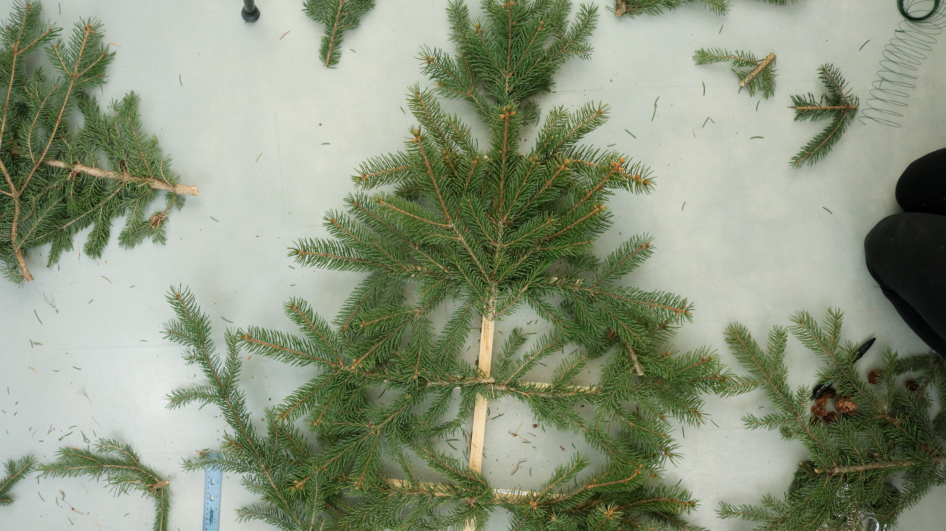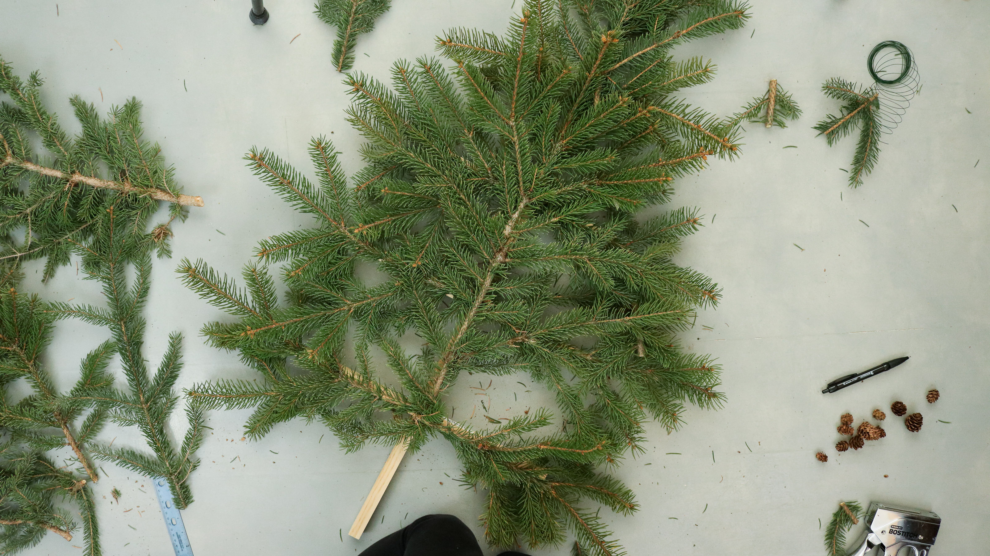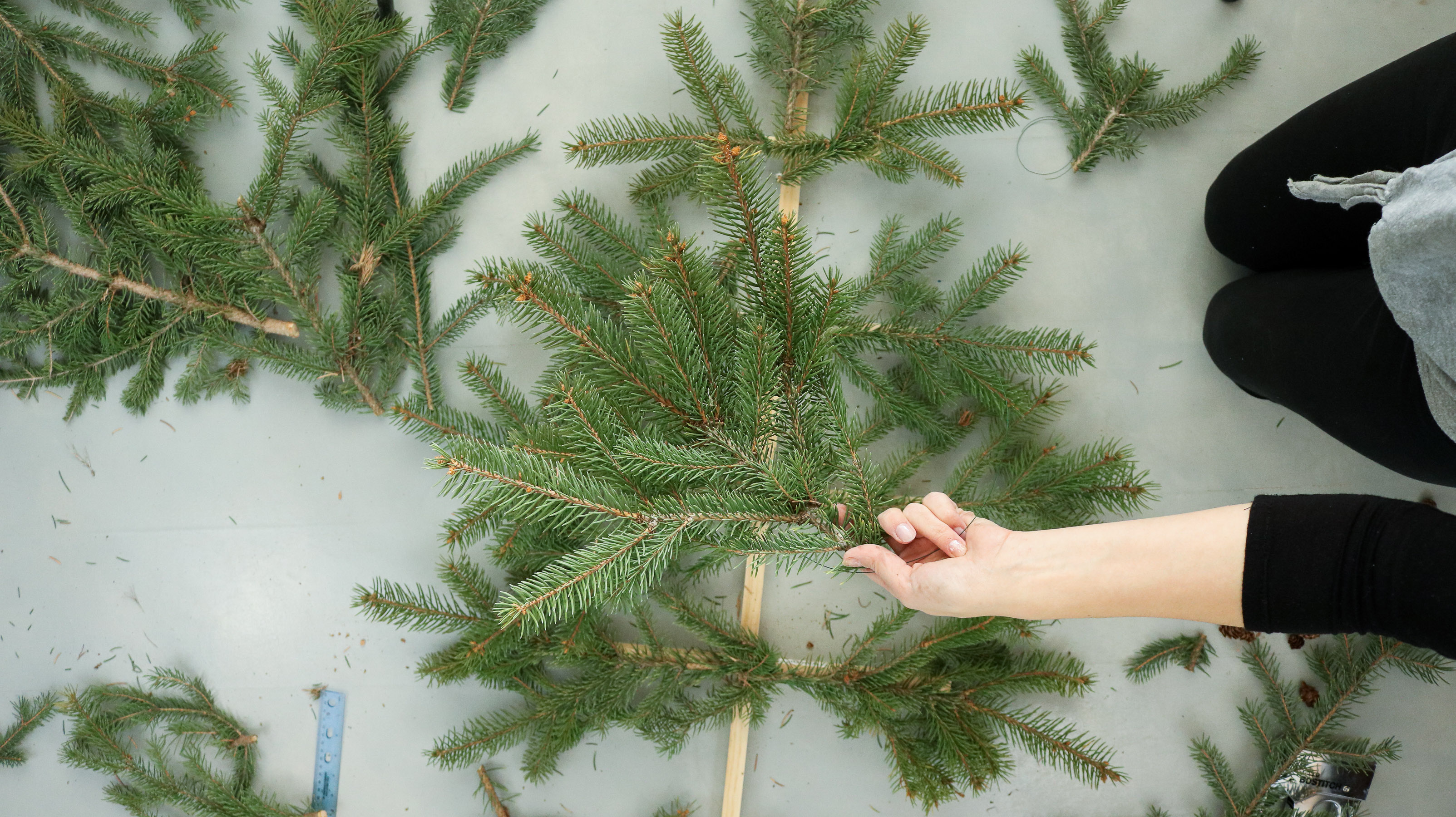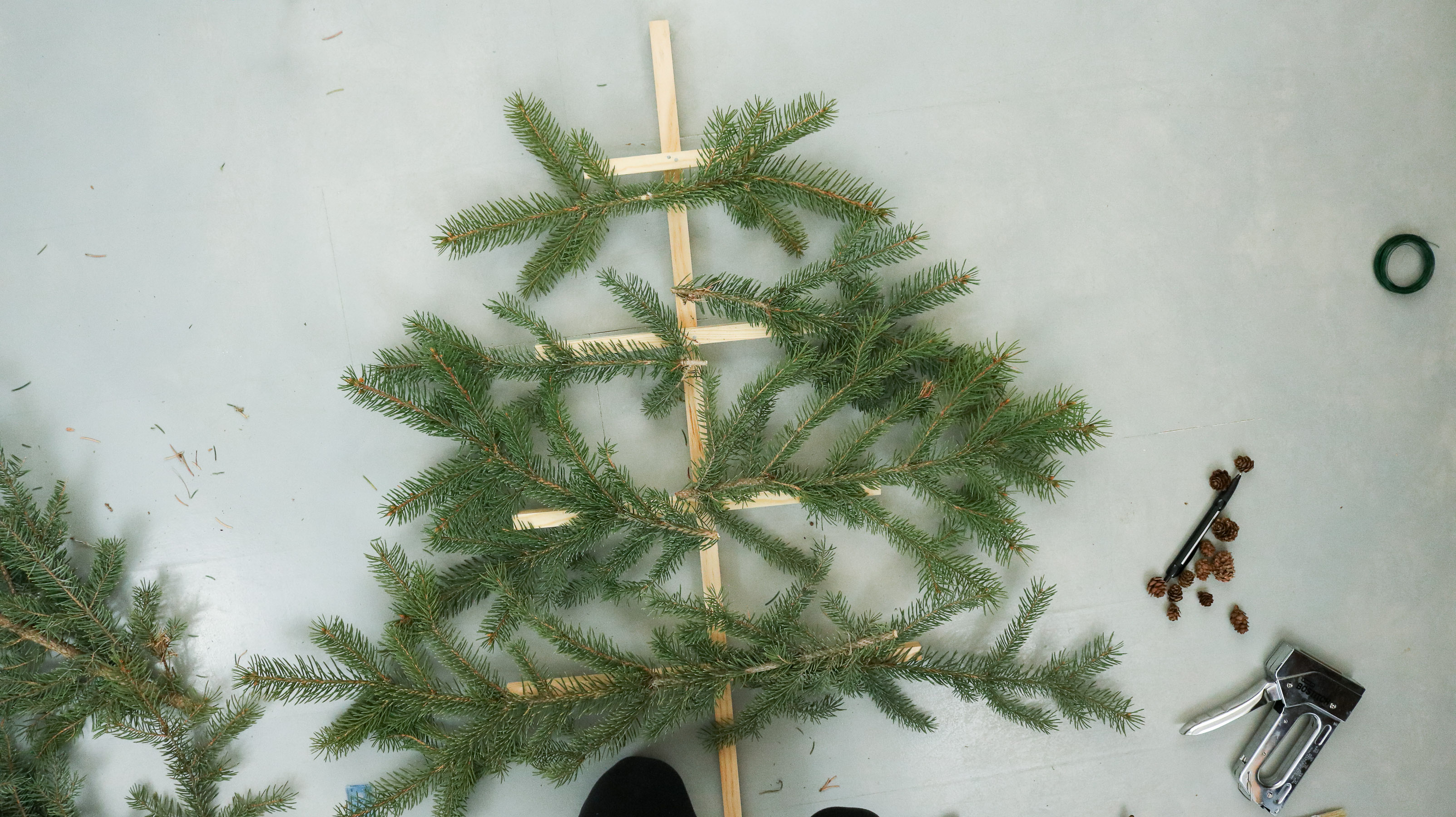 Than one by one start attaching them to your dowel with wire. Try and secure each branch in two separate spots. Closer to the center and on the edge.