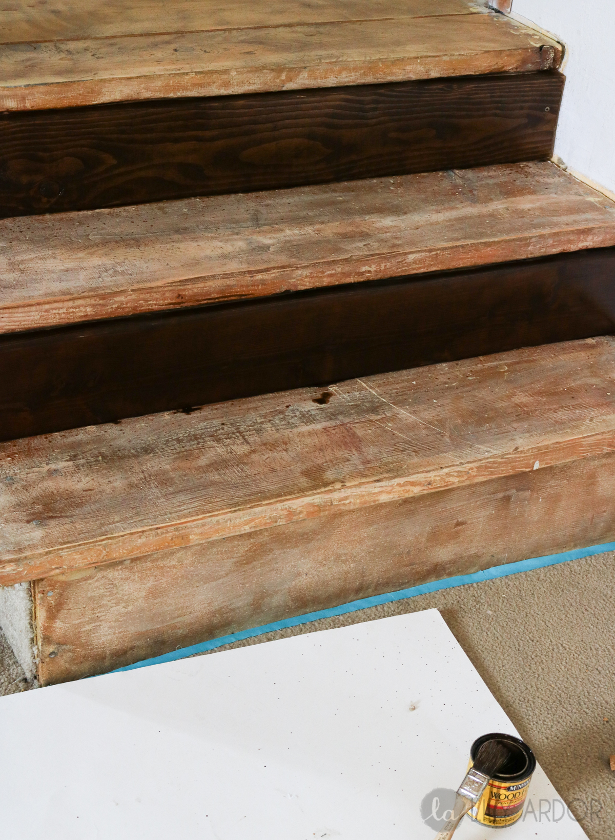 Okay so I’ve walked on these stairs like this for the past four years… YEP 4 whole years. lol. Yuk right..!! Wow they look worse then I remember. hehe 😀 These stairs are located toward the back of the house leading into a room that was considered our storage room so I didn’t care much until…, now that I’m turning this storage room into my craft room. 😀 😀